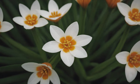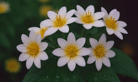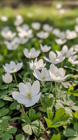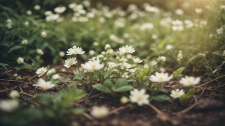 A charming arrangement of delicate white flowers thrives in a lush green meadow. The scene captures the beauty and serenity of nature during spring.