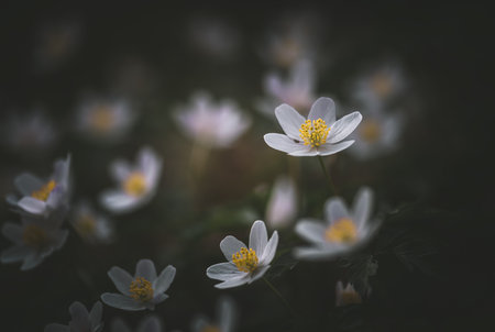 Close-up Shot, Wild Anemones Blooming at Night With White Petals Against a Dark Blurred Background