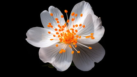 This stunning close-up image features a delicate white flower with vibrant orange stamens against a deep black background, emphasizing its natural beauty and elegance.