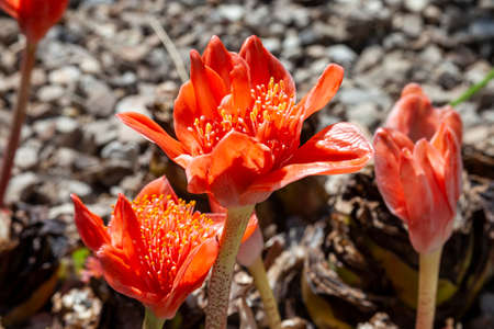 Haemanthus coccineus a red bulbous spring summer perennial summer flower plant commonly known as blood flower, blood lily or paintbrush lily, stock photo image