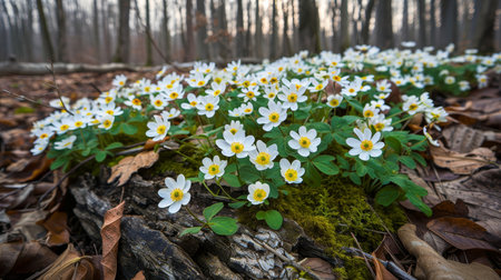White anemone flowers emerge in the serene forest ambiance, their delicate petals highlighted by the gentle touch of sunlight
