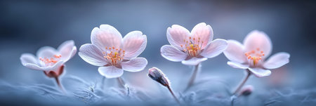 spring forest white flowers primroses on a beautiful gentle light blue background macro floral desktop wallpaper a postcard romantic soft gentle artistic image free space for text