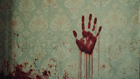 Haunting bloody handprint on faded floral wallpaper creating a chilling vintage horror vibe