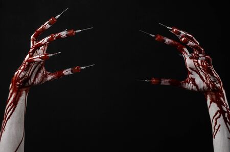 Bloody hand with syringe on the fingers, toes syringes, hand syringes, horrible bloody hand, halloween theme, zombie doctor, black background, isolated