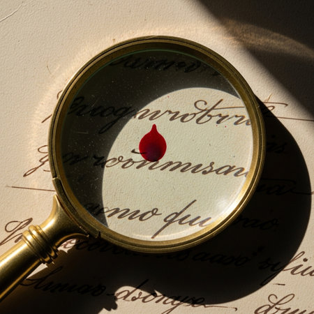 Heavy magnifying glass focusing on a drop of red ink on blurred vintage manuscript, harsh light, top