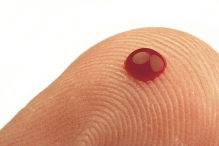 blood drop on fingertip from glucose test .The diabetic measures the level of glucose