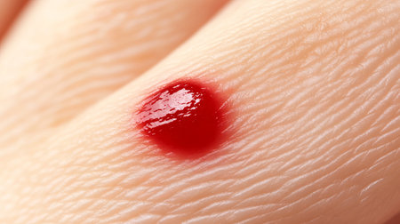 A detailed close-up image showing a red blood blister on a finger. The skin texture is visible, highlighting the injury's characteristics. Perfect for health-related themes.