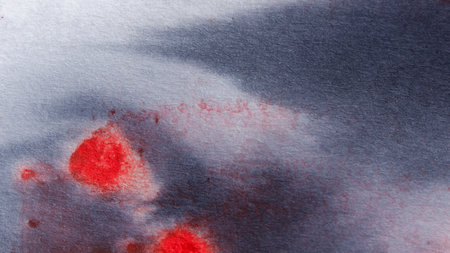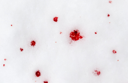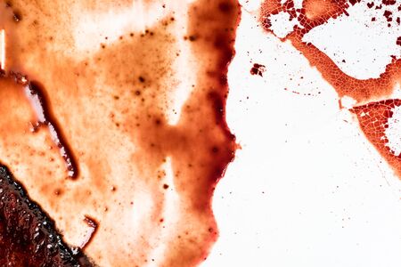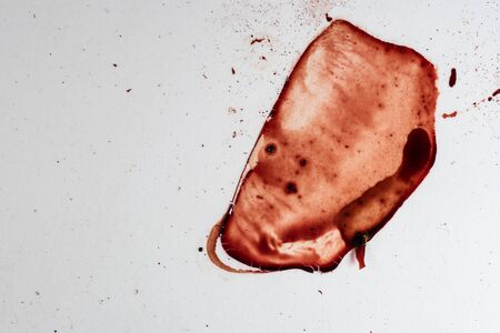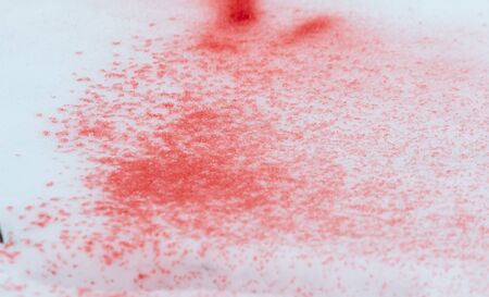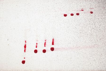 Blood-stained white surface. Disgusting view to the blood drops on whiteness. Bloody spits on white. Red spittles dripple on light background. Human wound. Bleeding research in medical laboratory.