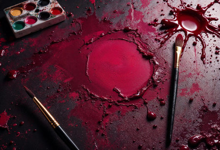 A rich crimson hue spreads across a textured surface, accompanied by paintbrushes and vibrant paint palettes. Droplets of color create an immersive and artistic vibe in the workspace.