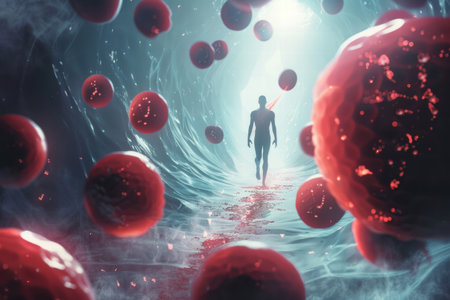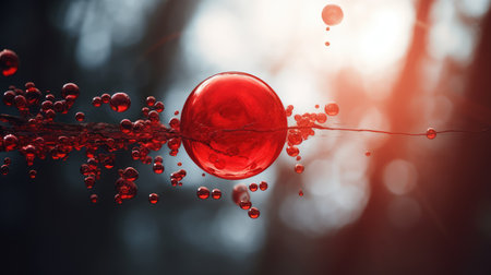Numerous red balls are suspended in mid-air, creating a compelling visual scene, Fantasy-style scenery created from different types of blood cells, AI Generated