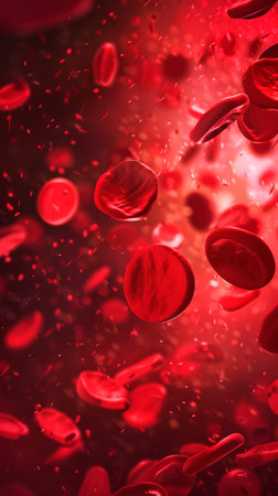 Vibrant depiction of circulating red blood cells. High-resolution erythrocytes image. Useful for educational content on blood function and cellular health. Space for text. Vertical