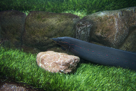 Mastacembelus erythrotaenia. Eel in the aquarium on the background of large stones and green grass.