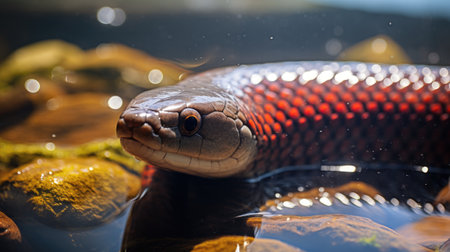 A close-up of an eel in an aquaculture tank, cultivated for high-demand Asian markets