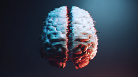 A fractured brain visual reveals a glitch effect against a dark gradient backdrop, highlighting an empty space at the center-right for an artistic touch.