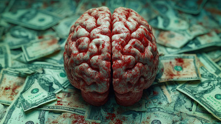 A human brain, stained with blood, rests on a bed of scattered dollar bills, creating a striking visual metaphor of the mind and money. Hyper-realistic and thought-provoking.