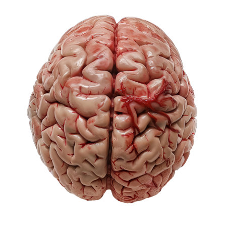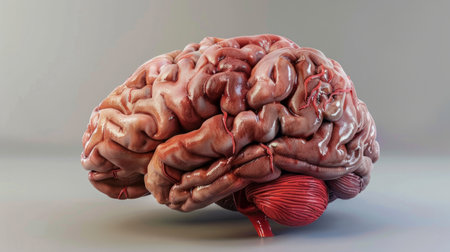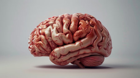 Anatomical model of human brain showing convolutions, lobes, and blood vessels for medical study