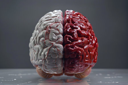 A striking representation of the human brain reveals its divided nature, featuring intricate neural pathways and vibrant blood vessels, symbolizing the complex interplay of thought and emotion.