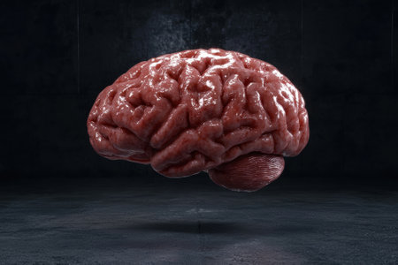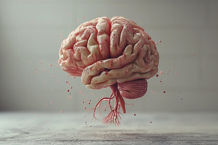 Highly detailed 3D render of a human brain showcasing its intricate structure and blood vessels against a dark background.