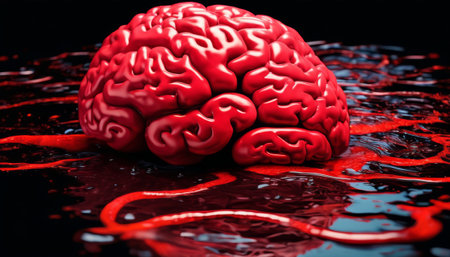 A vivid depiction of a human brain highlighted with bright red blood vessels, illustrating the complex vascular network and intricate structure of the nervous system.