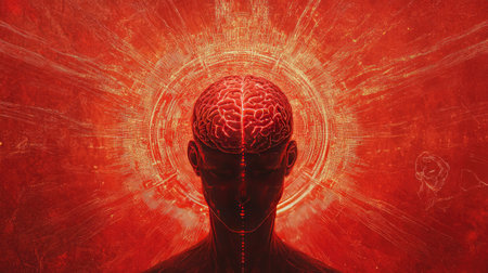 Conceptual representation of neural technology interfaced with a human brain on a glowing red background