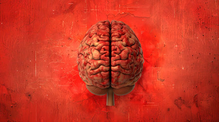 Human brain on a grunge red textured backdrop. Concept of psychology, neuroscience, mental health, creativity. Digital art.