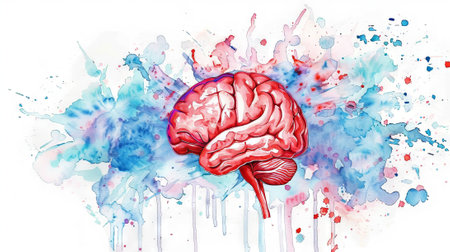 Watercolor illustration of a brain with vibrant colors and splashes. Colorful brain depicted in blue and pink hues. Concept of intelligence, creativity, neuroscience, cognitive science.