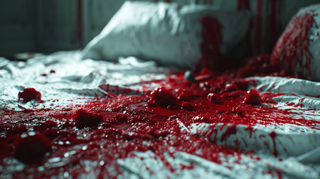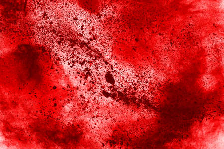 Splatter of red blood on wall in abandoned house. Halloween festival and event. Murder and Killer theme. Background for horror and scream film presentation. Criminal and social issues concept