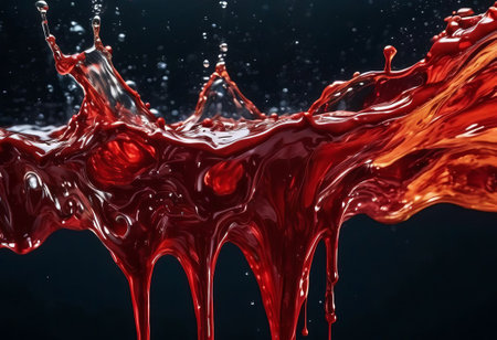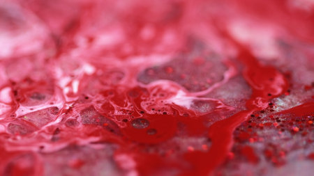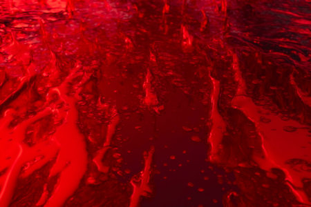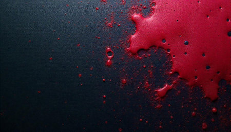 Dark textured surface splattered with a viscous red liquid