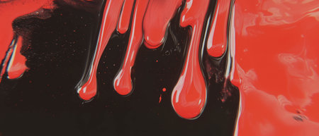 This captivating image features vivid red fluid drops on a smooth black surface, creating a dramatic and artistic contrast that highlights the beauty of liquid textures.