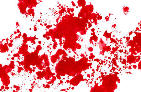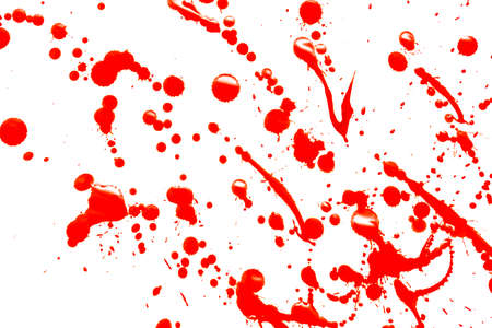 Red painted splashes, drops and trail as a blood on white background. Horror, crime, mysticism concept. Backdrop for halloween. Bloods splatter.