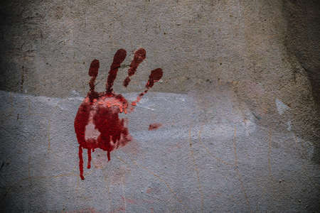 left side of bloody hand print on concrete wall in abandoned house.