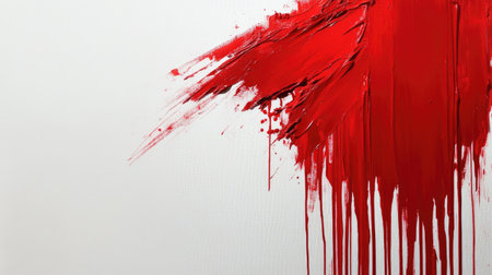 A striking abstract composition featuring a bold red paint splash on a minimalist white canvas, showcasing dynamic brush strokes and drips, perfect for modern art enthusiasts.
