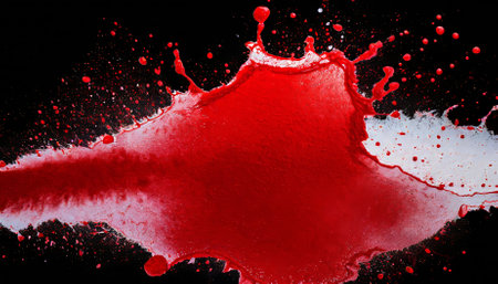 Fresh red blood splat on white porcelain with specks from the impact. Copy space area for horror themed concepts and ideas.