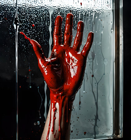 A crimson-coated palm is pressed against a dark, droplet-adorned windowpane. The stark red against the dim light creates a sense of urgency and intrigue. AI generation AI generation