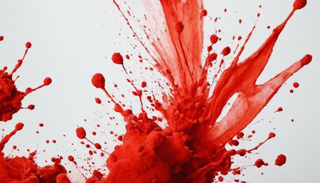 Bold red paint spills dynamically across a white canvas, showing vibrant contrasts and textures.