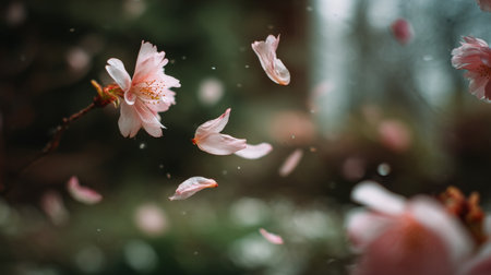 A captivating scene featuring cherry blossom petals gracefully floating through the air, embodying the essence of spring and peaceful beauty in nature.