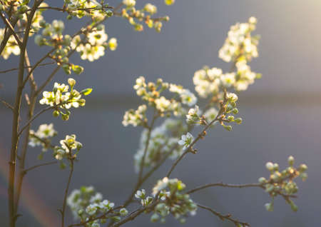 spring bloom of cherry or apple tree with white flowers at blue blurred background with lens flare