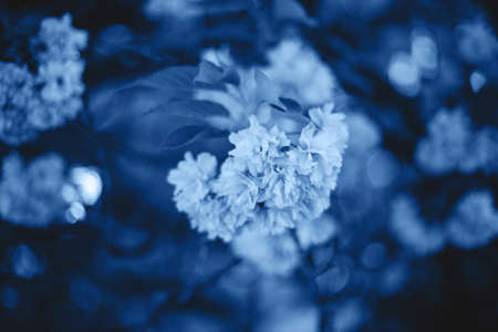 Blooming spring tree branches with white flowers, abstract border nature background. Classic blue