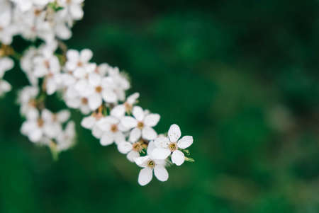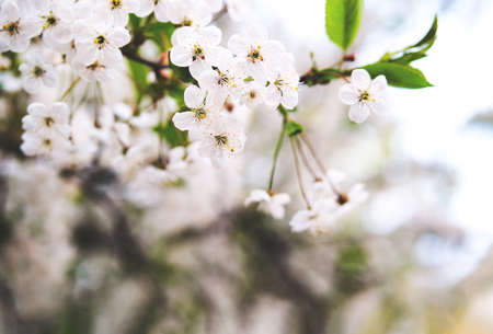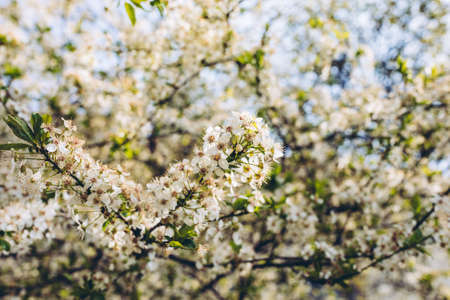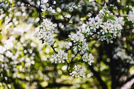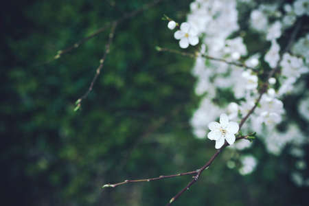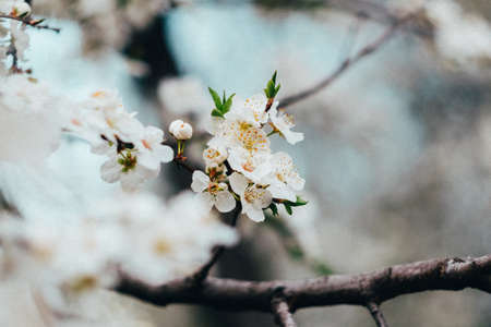 Fresh white flowers blooming on tree branches in spring, filtered close up.