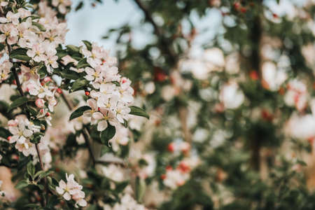Blooming Apple tree. White Apple blossoms on a branch close-up. Nature floral background. Live wall of flowers in a spring garden. Copy space.