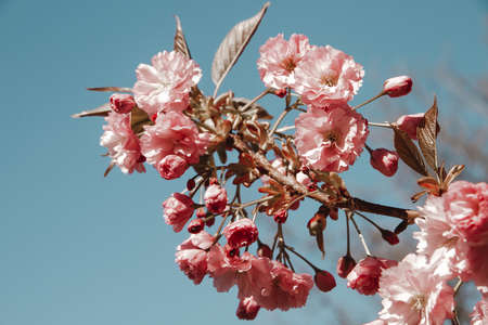 Japanese cherry blossom branch in spring. Blue sky background. Closeup view