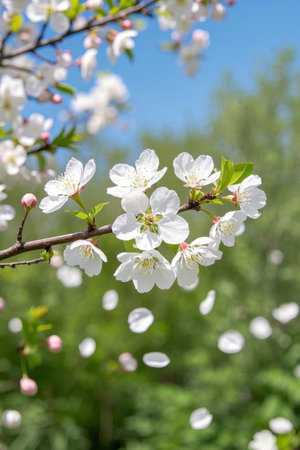 Delicate pink cherry blossom petals are swept away by a gentle wind against a vibrant blue sky. The scene captures the beauty of spring in full bloom creating a serene and joyful atmosphere.