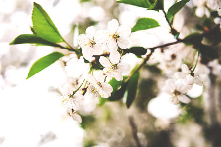 Cherry tree blossoming flowers with soft petals on natural floral background