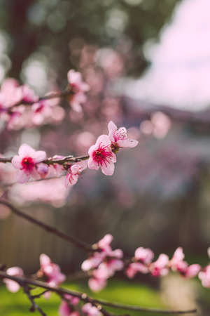 Branch with pink flowers of a sakura tree in the spring. Pink sakura.
