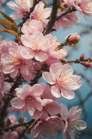 Beautiful pink blossoms on a tree branch with blue sky in the background, dark and moody
