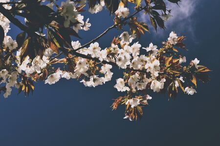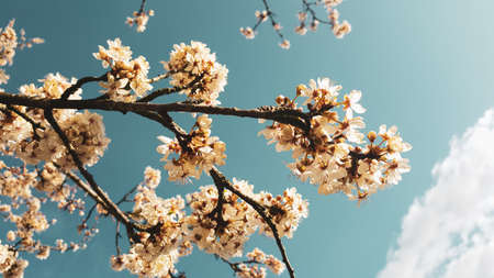 Fresh cherry tree branch with white flowers in a garden, against blue sky. Spring concept. Moody picture, soft selective focus, copy space