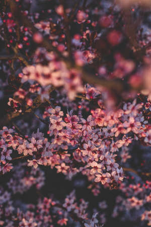 close-up of pink nectarine tree blossoms outdoor in beautiful backyard shot at shallow depth of field