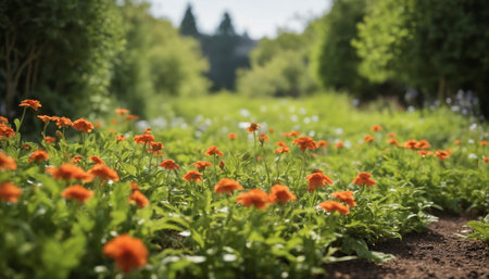 Vibrant Flower Bed with Lush Green Background Scenery