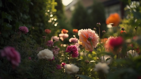 Vibrant flowers blooming in a garden with soft sunlight