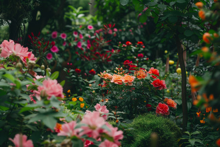 Vibrant flowerbed filled with roses and lilies in garden